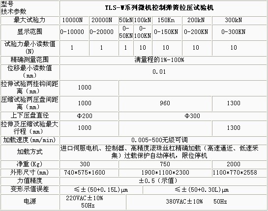 產(chǎn)品概述: TLS-WI系列微機控制拉壓彈簧試驗機依據(jù)JB/T7796-2005《拉壓彈簧試驗機技術(shù)條件》規(guī)定的技術(shù)要求制成。該型拉壓彈簧試驗機主要用 于測試各種螺旋彈簧及彈性元件的強度,青島彈簧試驗機廠家,即在一定的變形量(或高度)下測試彈簧的試驗力或在一定的試驗力下測定彈簧的高度或變形量。 功能特點: 本機主要適用于各種彈簧的強度試驗、力學性能及工序能力分析。 本機軟件包有速度控制、參數(shù)輸入、數(shù)據(jù)處理、結(jié)果觀察、圖表顯示、圖表打印、數(shù)據(jù)保存等功能模塊組成。 試驗方式多樣化,可以設(shè)置彈簧的試驗力,檢測彈簧的剩余高度或變形量;也可以設(shè)置彈簧的剩余高度或變形量,檢測試驗力等功能。 多點自動變速采集數(shù)據(jù),彈簧試驗機,并自動返回到初始位置,彈簧 試驗機,整個試驗過程自動化。 過載自動返回,以保護傳感器不受損壞。 具有強大的數(shù)據(jù)處理及數(shù)據(jù)統(tǒng)計功能,繪制剛度曲線、計算彈簧的分段剛度,可以進行數(shù)據(jù)統(tǒng)計,繪制正態(tài)分布圖、計算工序能力指數(shù)。采用數(shù)控電機調(diào)速系 統(tǒng)或進口交流伺服電機及調(diào)速器和精密滾珠絲杠副組成傳動系統(tǒng),與高精度負荷傳感器、位移傳感器及數(shù)字式數(shù)據(jù)采集卡、PC組成測控系統(tǒng),實現(xiàn)了穩(wěn)定可靠運行 及精確測量。 技術(shù)參數(shù): ![]() ![]()