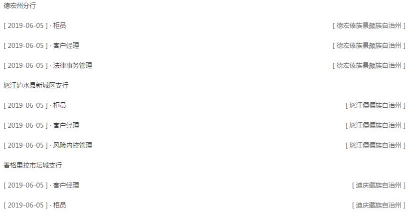 其中,怒江瀘水縣新城區(qū)支行、迪慶香格里拉縣壇城支行招聘學(xué)歷條件為具有國家統(tǒng)招的全日制普通高等院校大學(xué)專科(含)以上學(xué)歷。
