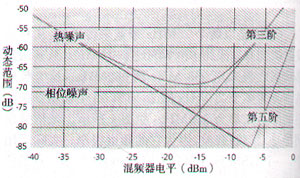 相鄰信道功率比(ACPR)或低電平IMD的測量要更困難,更需要注意頻譜分析儀的能力。圖2顯示了頻譜分析儀的熱噪聲、相位噪聲和第三、第五階交調(diào)失真與混頻器電平的關(guān)系。由于精確測量ACPR所需的動態(tài)范圍接近或超出了很多頻譜分析儀的性能極限,所以必須全面考慮之后才有把握進(jìn)行正確測量。
