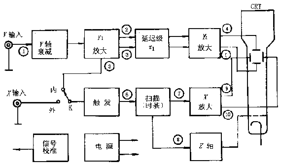 被測信號①接到“Y"輸入端經(jīng)Y軸衰減器適當衰減后送至Y1放大器(前置放大)推挽輸出信號②和③。經(jīng)延遲級延遲Г1時間到Y(jié)2放大器。放大后產(chǎn)生足夠大的信號④和⑤加到示波管的Y軸偏轉(zhuǎn)板上。為了在屏幕上顯示出完整的穩(wěn)定波形將Y軸的被測信號③引入X軸系統(tǒng)的觸發(fā)電路在引入信號的正(或者負)極性的某一電平值產(chǎn)生觸發(fā)脈沖⑥啟動鋸齒波掃描電路(時基發(fā)生器)產(chǎn)生掃描電壓⑦。由于從觸發(fā)到啟動掃描有一時間延遲Г2為保證Y軸信號到達熒光屏之前X軸開始掃描Y軸的延遲時間Г1應(yīng)稍大于X軸的延遲時間Г2。掃描電壓⑦經(jīng)X軸放大器放大產(chǎn)生推挽輸出⑨和⑩加到示波管的X軸偏轉(zhuǎn)板上。z軸系統(tǒng)用于放大掃描電壓正程并且變成正向矩形波送到示波管柵極。這使得在掃描正程顯示的波形有某一固定輝度而在掃描回程進行抹跡。
