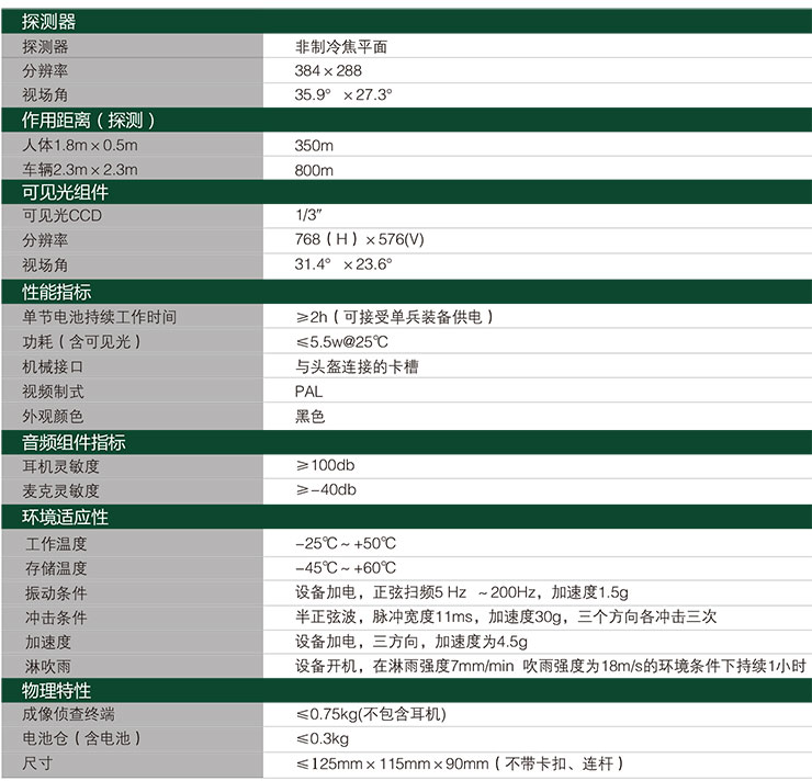 產(chǎn)品特點(diǎn) 多傳感器集成 集可見光、紅外、音頻于一體,紅外熱像儀測(cè)溫技術(shù),能在夜間及惡劣氣象條件下輔助單兵進(jìn)行偵察